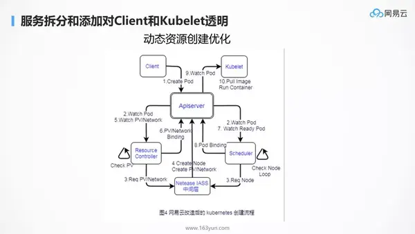 如图是定制化的容器创建流程,由于大促和非大促期间,节点的数目相差比较大,因而不能采用事先全部创建好节点的方式,这样会造成资源的浪费,因而中间添加了网易云自己的模块 Controller 和 IaaS 的管理层,使得当创建容器资源不足的时候,动态调用 IaaS 的接口,动态的创建资源。这一切对于客户端和 kubelet 无感知。