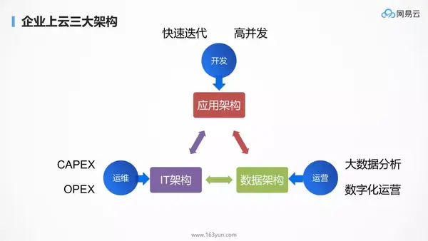 如图所示,企业上云的三大架构为 IT 架构、应用架构和数据架构,在不同的公司,不同的人、不同的角色,关注的重点不同。