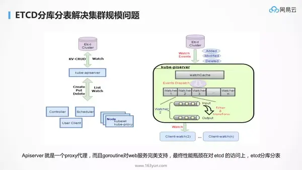 为了解决超过 3 万个节点的规模问题,网易云需要对各个模块进行优化,由于每个子模块仅仅完成自己的功能,Scheduler 只管调度,Proxy 只管转发,而非耦合在一起,因而每个组件都可以进行独立的优化,这符合微服务中的独立功能,独立优化,互不影响。而且 Kubernetes 的所有组件都是 Go 开发的,更加容易一些。所以 Kubernetes 上手慢,但是一旦需要定制化,会发现更加容易。