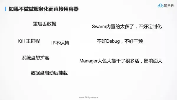 Swarm 内置的功能太多,都耦合在了一起,一旦出现错误,不容易 debug。如果当前的功能不能满足需求,很难定制化。很多功能都是耦合在 Manager 里面的,对 Manager 的操作和重启影响面太大。