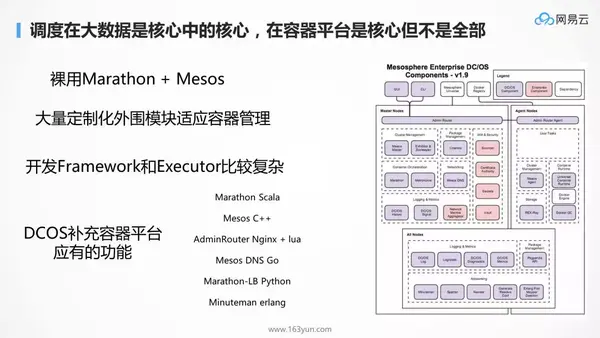 原来大数据运维工程师出身的,会比较容易选择 Mesos 作为容器管理平台。不过原来是跑短任务,加上 marathon 就能跑长任务。但是后来 Spark 将细粒度的模式 deprecated 掉了,因为效率还是比较差。