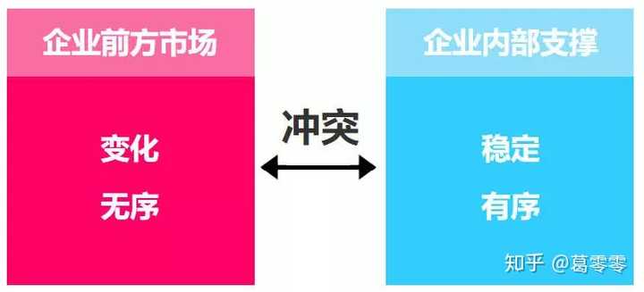 用户和用户的需求永远是善变的。依稀记得“80后是垮掉的一代”的说法的你,现在看到的却是“被10后毁掉的90后父母”的感叹。主流用户的变化,不会因为某个年代人的话语权高低而稳定下来。而即便是同年代的用户,在随着现代社会发展和各行各业互联网服务的滋养中又进化细分成了出不同的支流,需求全然不同,呈现场景化、碎片化的特征。为了不被善变的用户所抛弃,企业不得不跟随着用户,为了满足用户而尽可能积极地响应用户需求的变化,发展新业务、提供新服务。这就给企业的前方业务端提出了挑战,必须做到快速响应、灵活运转。但要作为一个能承接大量新业务和新服务的大体量企业,业务想要做到量大又灵活,必定需要靠企业内部科学有序体系的稳定支撑。所以,企业前方市场总是会趋于变化无序,而企业内部支撑总归要趋于稳定有序,两者必定冲突。