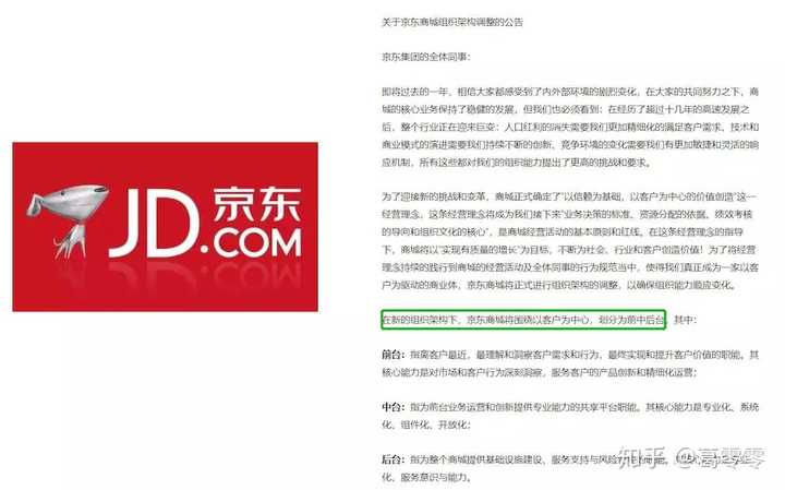 2018年12月21日,京东商城组织架构调整划分为前中后台
