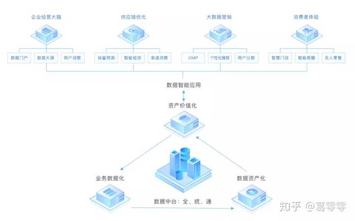 “数据中台”整合前后台技术系统数据,提供数据存储、数据模型和服务封装,全面支持前台和后台各种个性化数据服务需要;