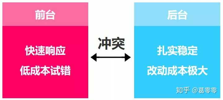 前台是对接用户的,所以系统需要快速响应前端用户的需求,快速创新、快速迭代。简而言之,快速建设、错了就推翻重来、不能耗费太大成本。