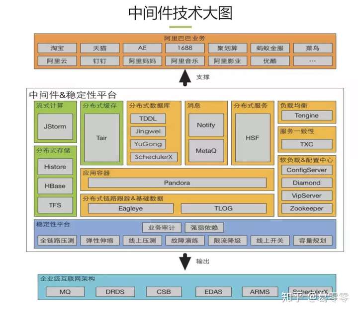 阿里技术中台将各种技术中间件等能力进行整合包装,过滤掉技术细节,向前台、业务中台、数据中台提供简单一致、易于使用的应用技术基础设施的能力接口。