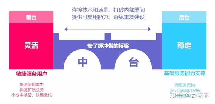 中台就像是一条“安了缓冲带的桥梁”,连接了灵活的前台和稳定的后台的同时,穿透了企业内部部门墙等隔阂。它的核心是企业基础服务能力,目标是支持前台小成本地快速创新迭代,运用后台技术手段(微服务架构、DevOps基础设施和公共服务设施等),提供可以供前台复用的公用能力。