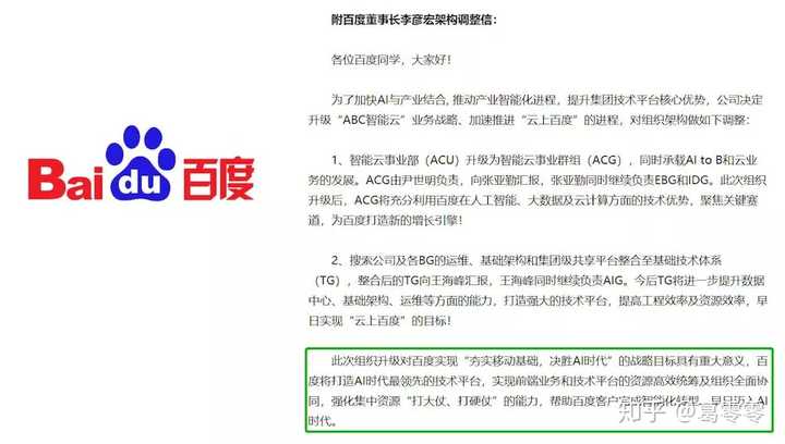同年12月18日,百度集团进行了一次大的架构调整,由百度创始人、董事长李彦宏发信宣布:”百度将打造AI时代最领先的技术平台,实现前端业务和技术平台的资源高效统筹及组织全面协同。”
